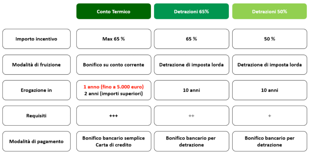 Il Conto Termico richiede più adempimenti burocratici rispetto alle detrazioni, ma ha un grande vantaggio: per incentivi di importo fino a 5.000 euro, il rimborso avviene in un’unica rata, erogata entro 60 giorni dall’accettazione della domanda di incentivo.